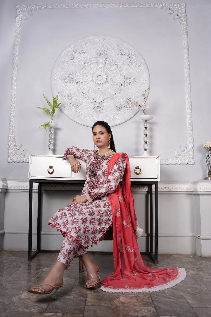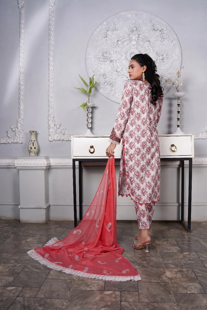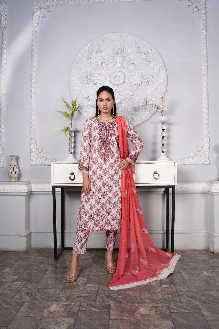 Printed Lawn Trouser: Coordinated with a matching printed lawn trouser, this outfit delivers a cohesive and fashionable look. The fabric is lightweight and easy to tailor, making it ideal for everyday use.