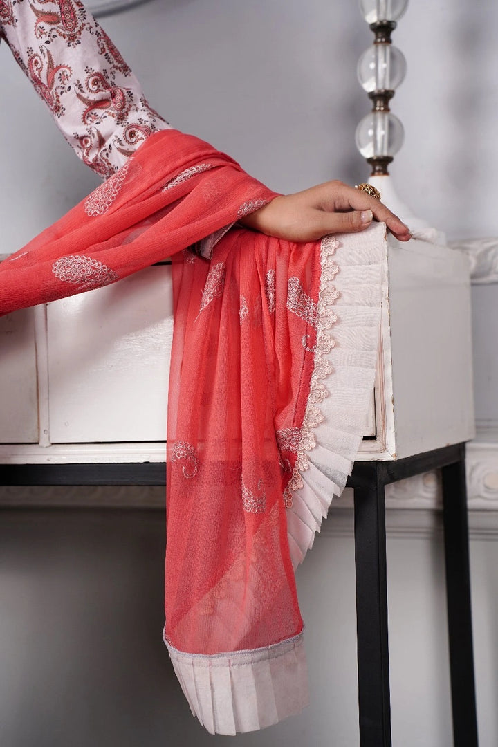 Chiffon Dupatta with Embroidered Patchwork: The ensemble is beautifully complemented by a flowy chiffon dupatta, adorned with delicate embroidered patchwork that adds elegance and sophistication to the overall design.