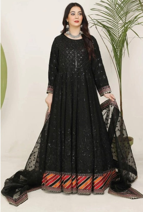 3-Piece Formal Stitched Wedding Suit for Women – Embroidered Chiffon Shirt, Trouser & Dupatta