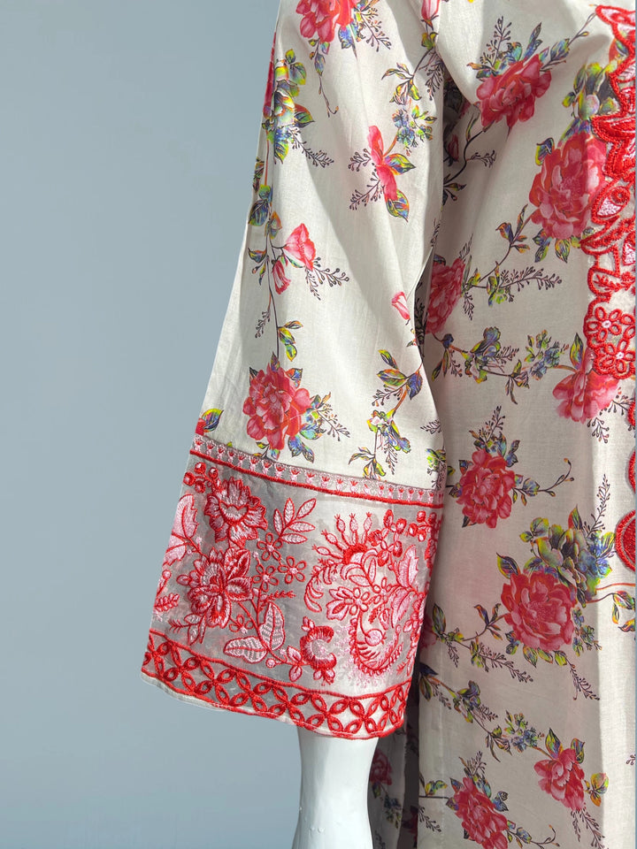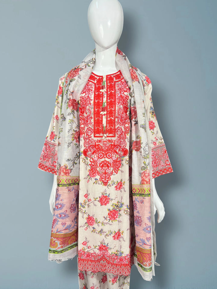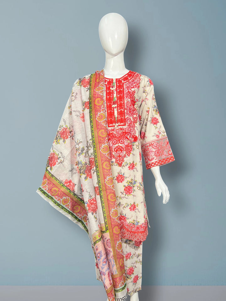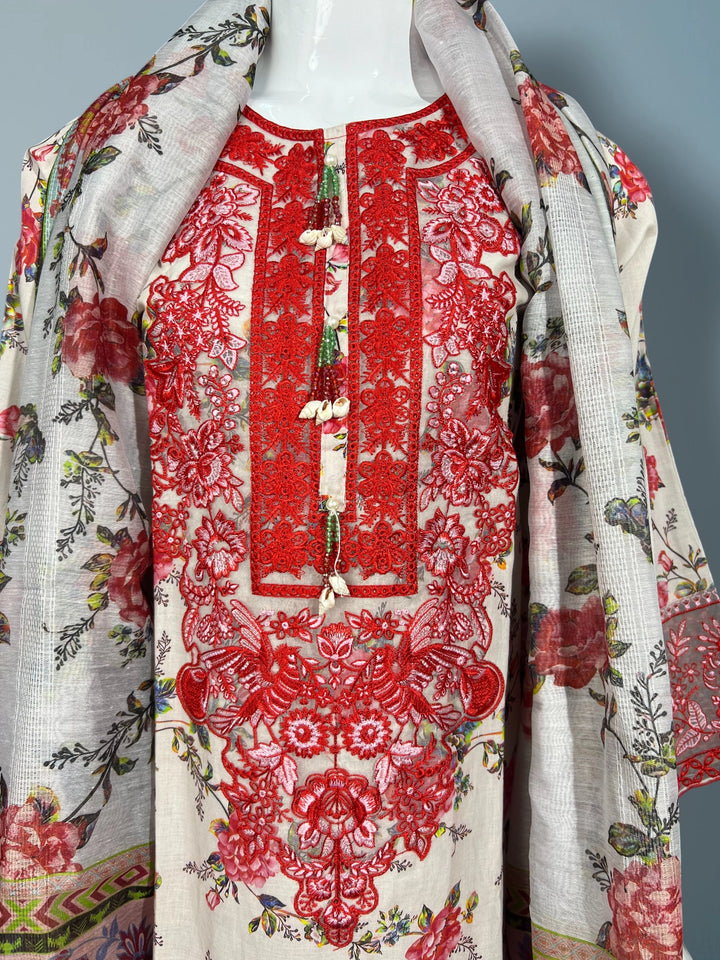 Embrace timeless elegance with Floral Whispers, a beautifully designed stitched 3-piece lawn suit for women. This outfit features a stitched lawn printed shirt, paired with a matching trouser, and a stylish cotton net printed dupatta. To enhance its charm, the shirt is detailed with embroidered patchwork, giving it a graceful and sophisticated appeal.