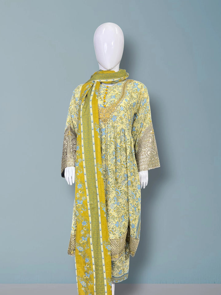 Redefine elegance with Kashmiri Charm. This ready-to-wear ensemble features a stitched printed lawn shirt adorned with intricate work, paired seamlessly with a coordinated printed trouser and a lightweight lawn dupatta. A perfect blend of comfort and sophistication, designed to keep you stylish all season long.