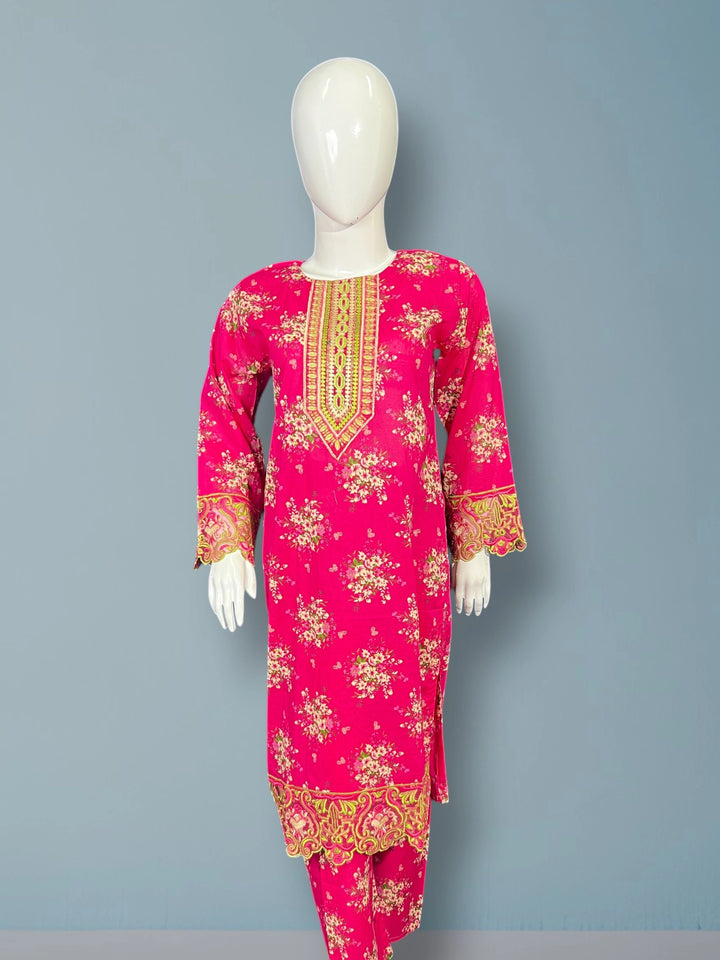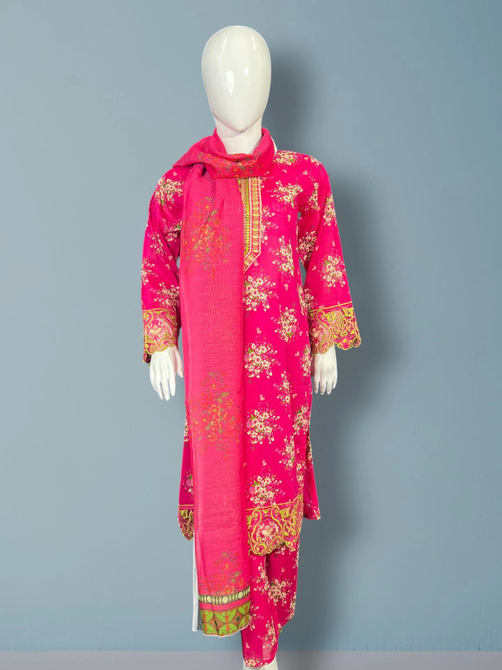 Step into effortless elegance with Meadow Mist, a stylish stitched 3-piece lawn suit for women. This outfit features a printed lawn shirt with delicate embroidered neck work, paired with a matching printed trouser, and a beautifully designed Domind dupatta for a graceful finishing touch.